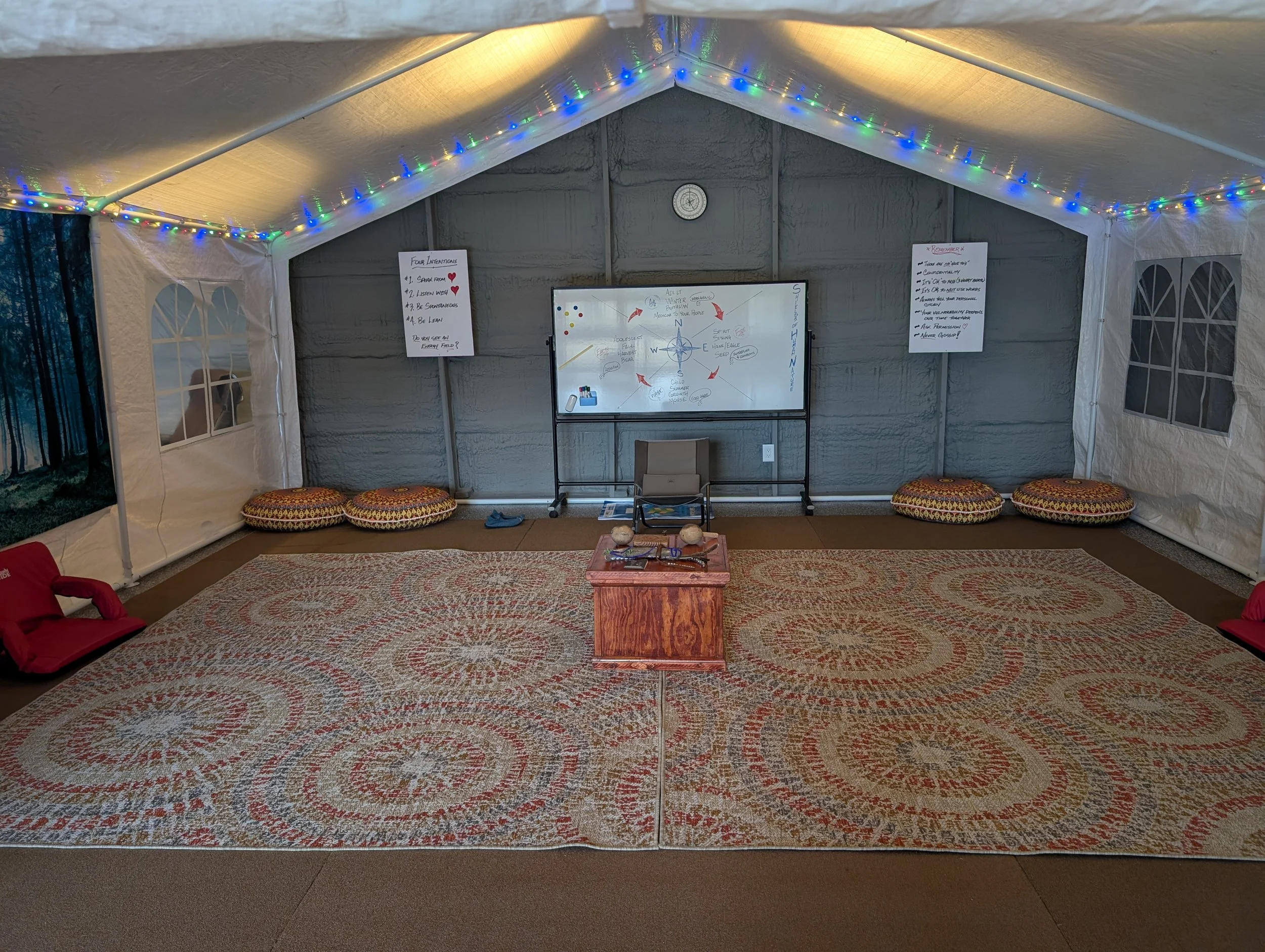Inside is a pottery studio, an intimate place for us to gather, a fitness center, and comfy places to chill in between gatherings.
